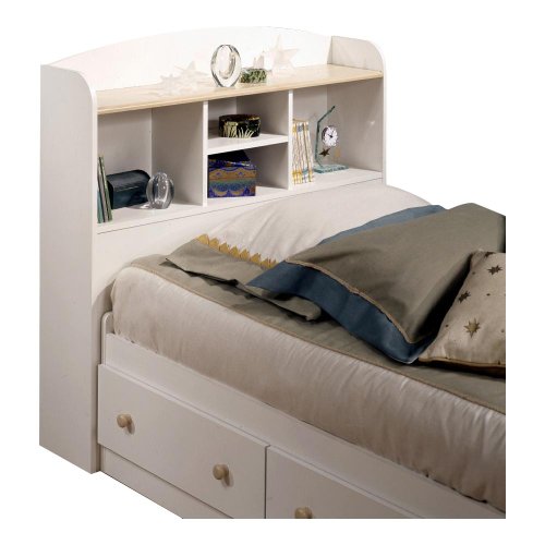 Extra storage where you didn't have it before—this bookcase headboard holds toys, alarm clocks, lighting, books and more. The unit offers 3 storage areas and a punch-out hole for convenient wiring, and the popular Shaker-style design features a natural maple and white finish that blends easily with any décor. Match with additional pieces from the Natural Maple and White Collection, Natural Maple Collection, or Natural Maple and Antique Blue Collection (all sold separately). Made of fiberboard. Imported. 42Hx43Wx10D".