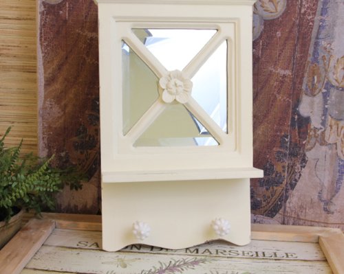 This little cottage style mirror has two ceramic knobs. Use it in the entry way so you can check your lipstick on the way out or use it in the bathroom to hang your robe. width: 12 inches and height: 19 inches.