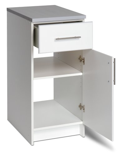 This 16-inch wide base cabinet combines a 20 inch long drawer and a door that can be mounted to open left or right to suit your configuration. The heavy duty drawer has a half-inch thick bottom and metal sides which roll on smooth roller glides. Includes one adjustable shelf and is topped off with a 1” thick worktop with a durable melamine surface. ELITE’s quality features include distinctive Soft Edged Doors, Designer Hardware, Attractive Finishes, European Style Hinges, 1” Work Surfaces, and Heavy Duty Drawers.