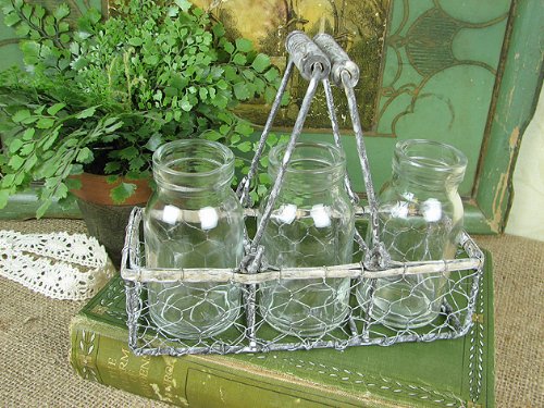 This little wire basket looks like an antique find. It comes with three glass bottles that are perfect for spring blossoms. Basket is 7 1/2 inches long and bottles are 4 inches tall.
